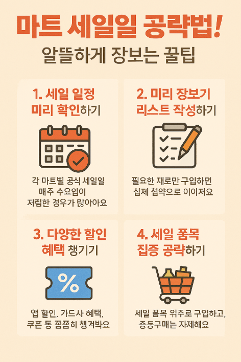 마트는 '싸 보이는' 것이 많지만, 무계획으로 들어가면 오히려 지출만 늘 수 있습니다. 마트 세일일을 제대로 공략하면, 한 달 식비도 줄이고 식재료 낭비도 막을 수 있어요.